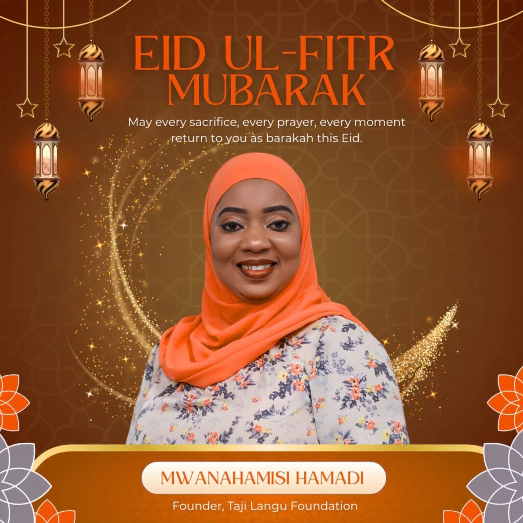 Media personality and Founder of Taji Langu Foundation, Mwanahamisi Hamadi, conveyed her Eid message, wishing that every prayer and sacrifice made during Ramadan returns as blessings to the faithful.