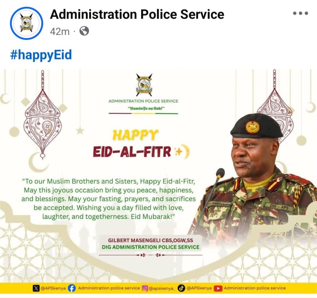 The Administration Police Service, through Deputy Inspector General Gilbert Masengeli, also extended warm wishes to Muslims, expressing hope that the occasion brings peace, happiness, and togetherness while acknowledging the spiritual significance of fasting and prayer.